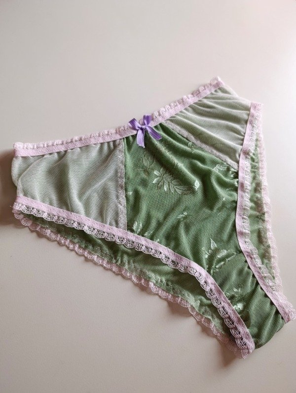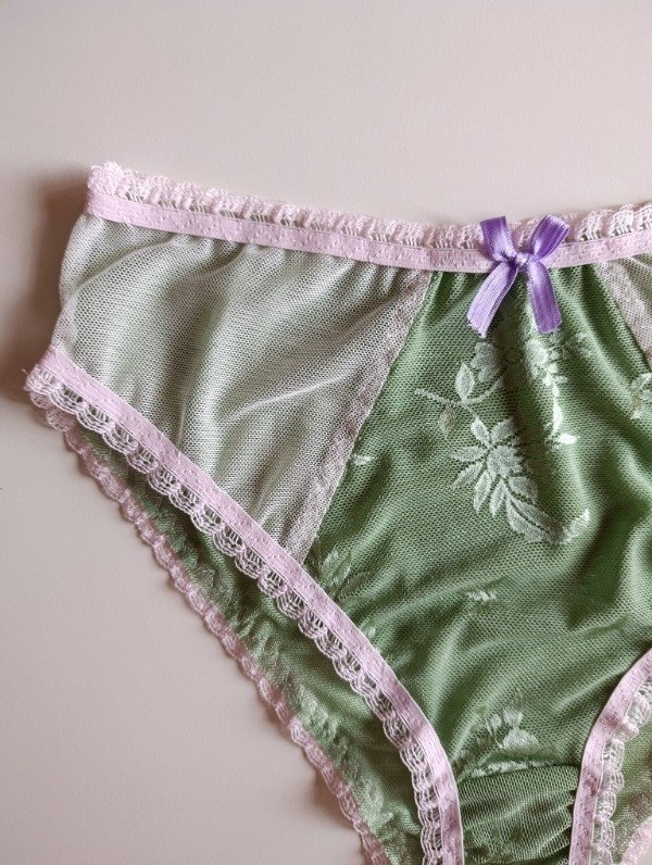Trusa confeccionada en microtul verde suave con labrado de flores,recorte en microtul hueso liso y elásticos rosa.