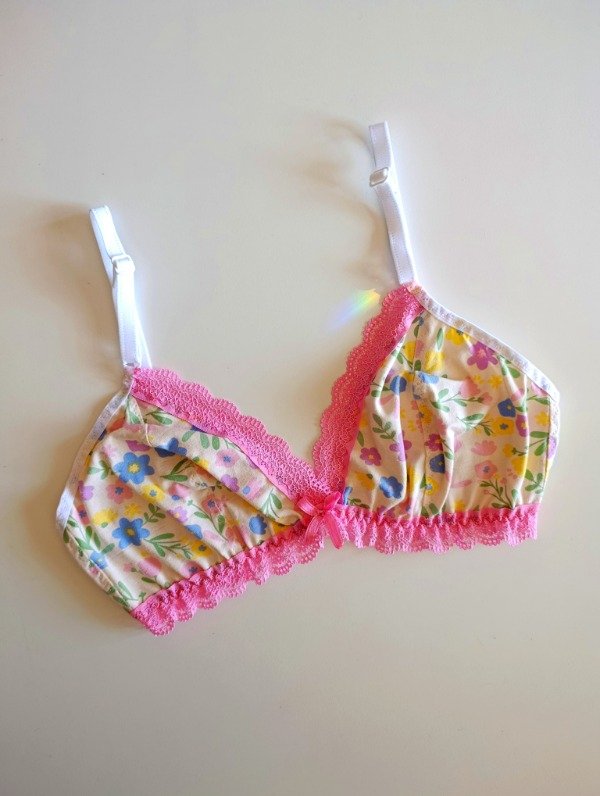 Corpiño triangulito de algodón con detalle de puntilla rosa chicle en copas,breteles de 11 mm, correderas y arandelas plásticas hipoalergénicas y espalda regulable