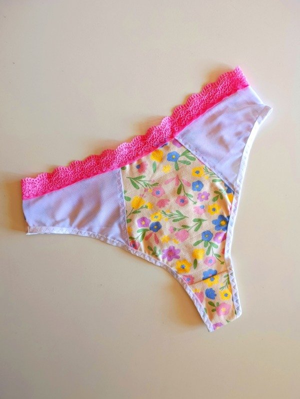 Less de algodón floreado con detalle de microtul unicamente en los laterales del frente. El resto todo algodón