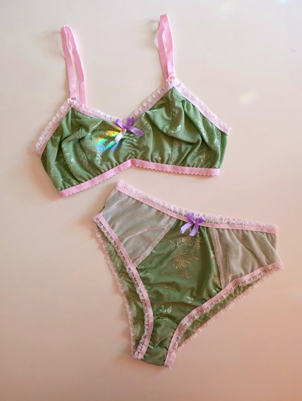 Conjunto confeccionado en microtul verde labrado. Elásticos rosa.