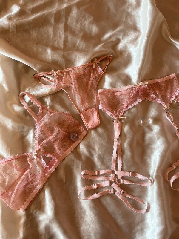 El set Lolita está confeccionado en plumetí rosa y contiene corpiño, less con recorte y un portaligas. Con detalles de puntilla elastizada y todos sus breteles son regulables.
