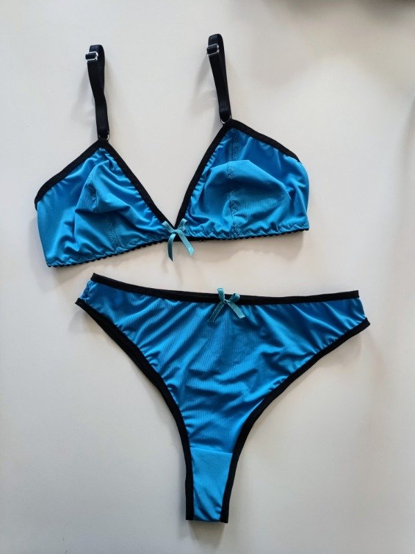 Conjunto confeccionado en microfibra turquesa con elásticos negros y avíos hipoalergénicos. La bombi es vedetina, pero también hay una less disponible en ese tono. Ante la duda consulta. Espalda regulable.